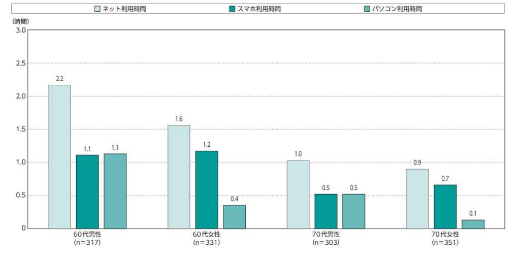 また、同研究所のモバイル社会白書2023年版によると、スマホとパソコンの双方で、60代男性の約6割、女性の5割は1時間以上インターネットを利用。70代は男女とも約5割が30分以上インターネットを利用しているそうです。ただ、女性の場合、60代、70代ともに圧倒的にパソコンよりもスマホでのインターネット利用が多いとなっていました。確かに、周囲を見回してみても、シニア世代の女性でパソコンを所有している人は少ないと思います。というよりも、デジタル社会にシフトし始めた時には50代くらいであったことを考えますと当然の流れかもしれません。